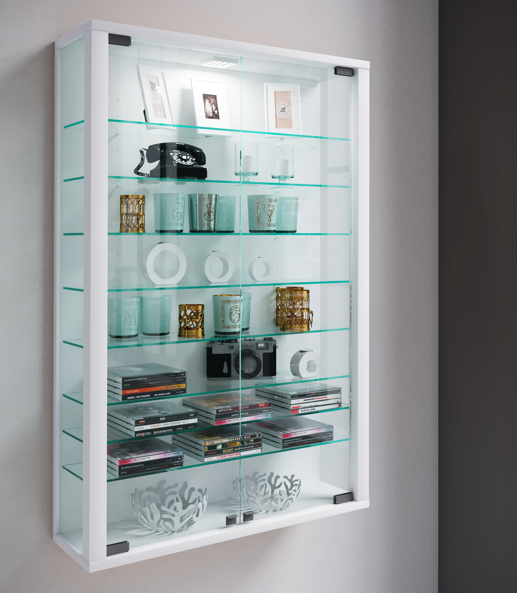 Vitrosa Mini vitrineskab, væghængt med 2 glaslåger og lys, hvid
