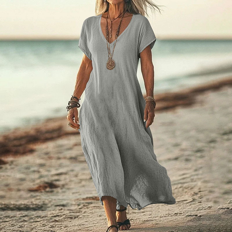 Women's Midi Dress Sundress A Line Dress Vacation Casual Beach linen like Going out Loose Fit Short Sleeve V Neck claret Orange off-white Dark Gray