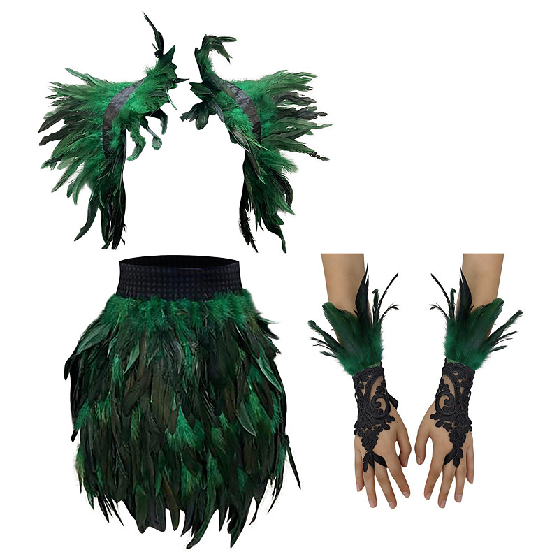 3Pcs Women's Feather Costume Set: Gothic Feather Cape Shawl, Mini Skirt Long Lace Wrist Cuffs, Black Teal Raven Cosplay Outfit