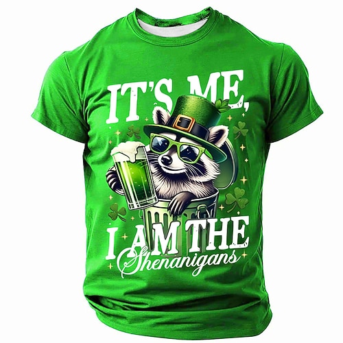 St. Patrick's Day Herren-T-Shirt „It's me I am the shenanigans" – lustiges Waschbär-Kobold-Hut-Motiv mit grünem Bier-Kleeblatt-Print, Kurzarm-T-Shirt mit humorvollem Trash-Panda-Motiv, Feiertags-Top,