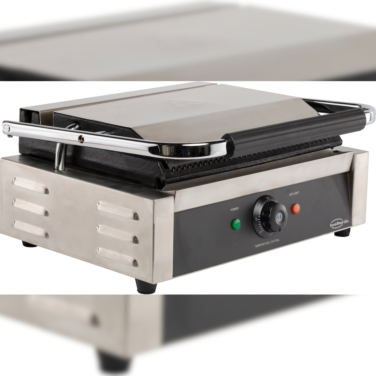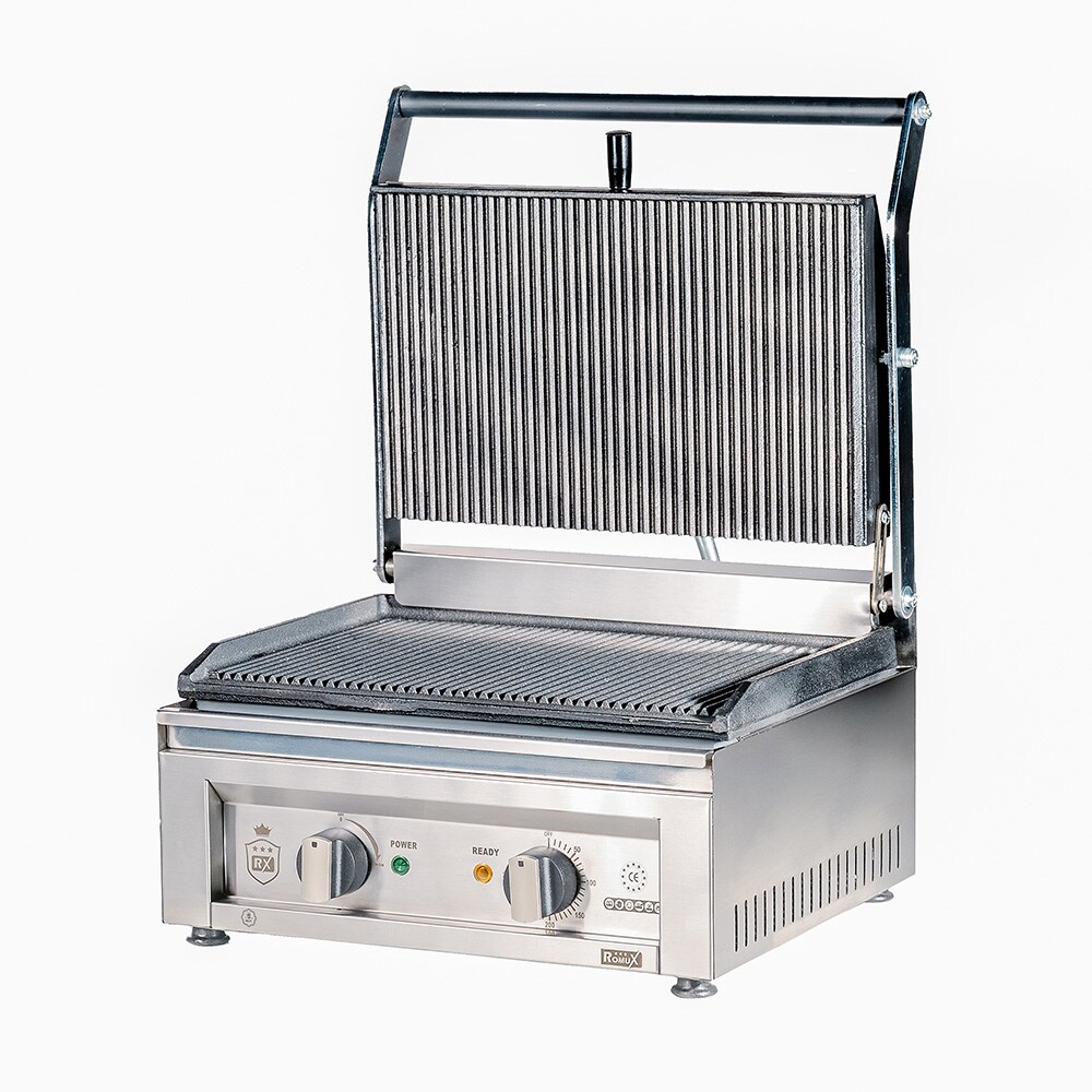 Romux® Kontaktgrill Panini Elektrisch 40 cm Einfach Tischgerät aus Edelstahl mit Doppelter Gerillter Grillfläche | Kontaktgrill 300° - 1800 W