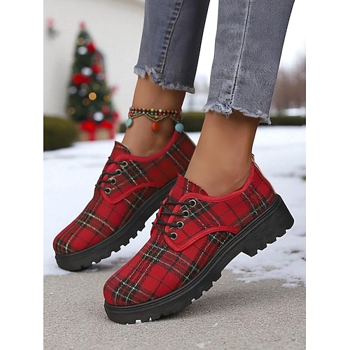 scarpe oxford stringate rosse a quadri da donna, scarpe casual con motivo tartan vintage, perfette per outfit natalizi, moda invernale e riunioni di festa