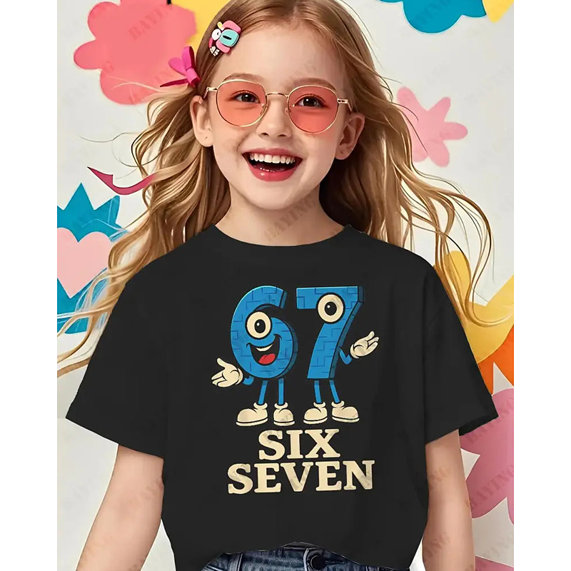 Cotton Kids Girls' Black Graphic Funny Slang 67 T shirt Tee Crew Neck Short Sleeve Vacation Sports Outdoor Dailywear Streetwear Casual Printing Summer