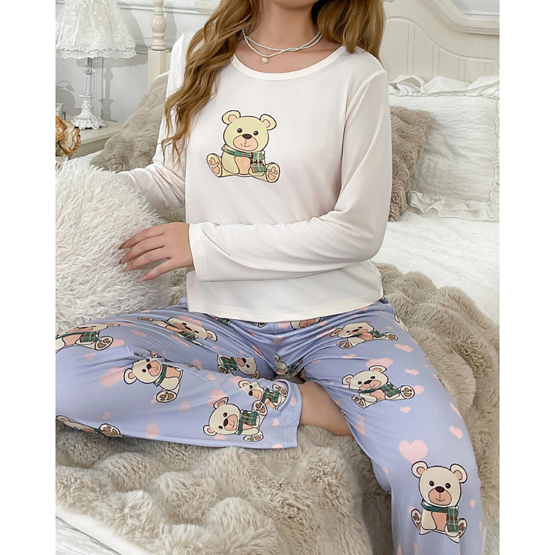 Women's Pajamas Loungewear Pajama Set Casual Cartoon Elastic Waist Pant Vacation Home Daily Long Sleeve Crew Neck White Fall Winter Regular Fit