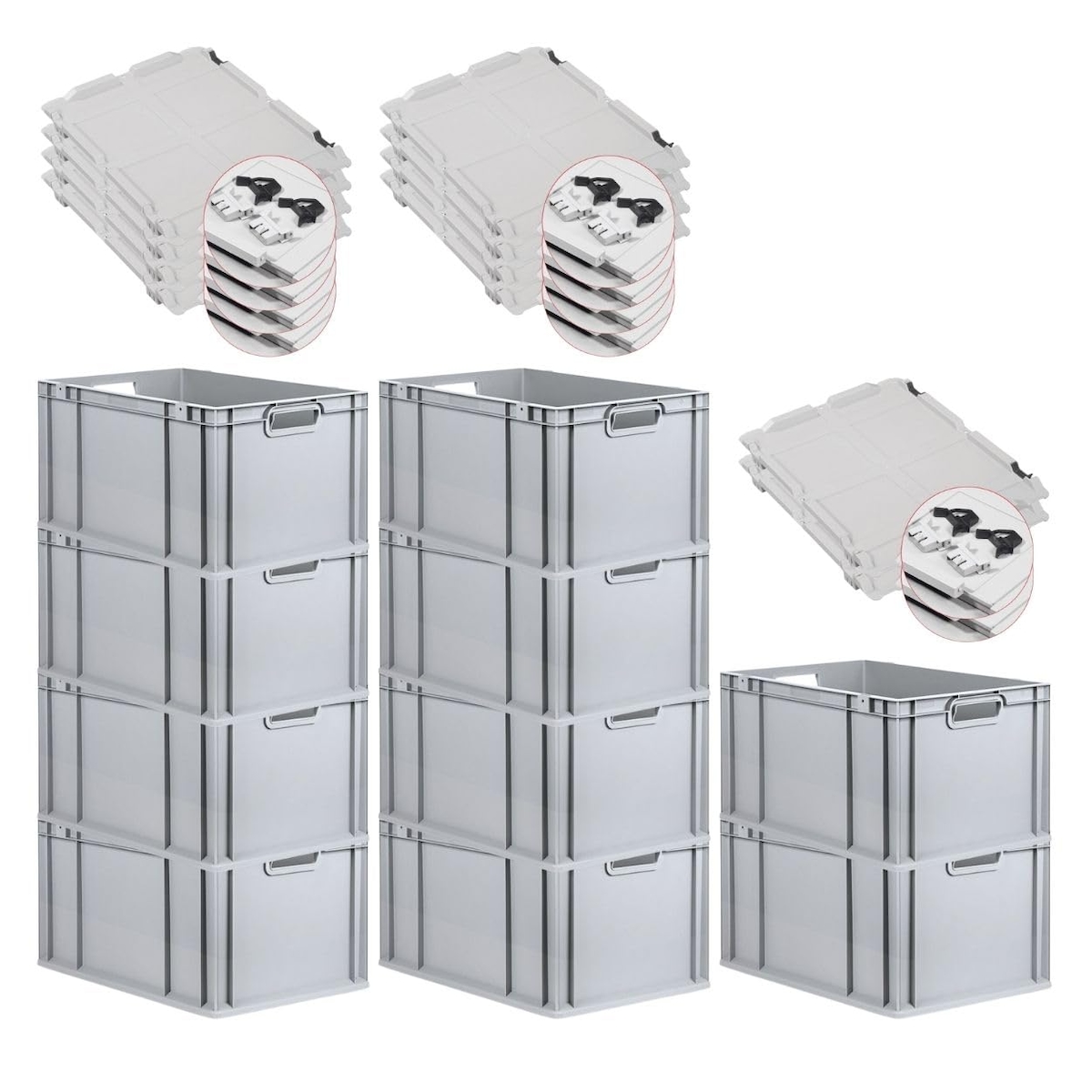 PROREGAL SuperSparSet 8x Eurobox NextGen Economy mit Auflagedeckel & 4x Verschlüsse Rot, Griffe offen, HxBxT 22x30x40cm, 20L, Eurobehälter, Box