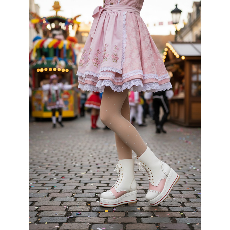 Women's Rose Pink Platform Wedge Boots with Scalloped Trim – Sweet Lolita Style Lace-Up Shoes for Anime Cosplay Carnival Parades