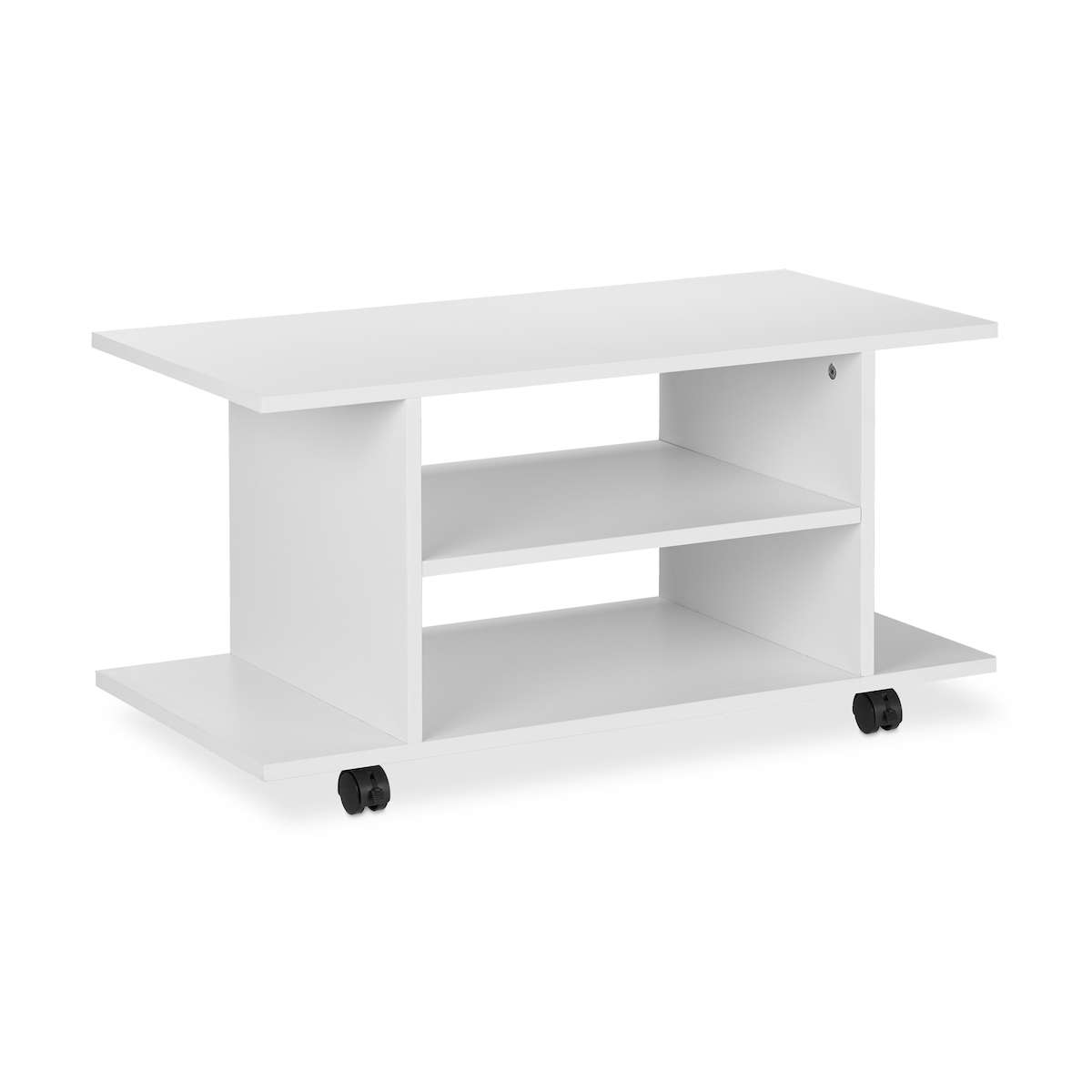Relaxdays TV Board mit Rollen, 4 offene Ablagen, fahrbarer Couchtisch, für Geräte, CDs, DVDs, HBT 40 x 80 x 40 cm, weiß