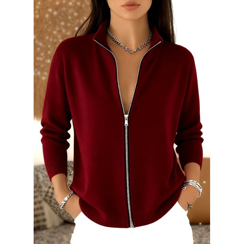 Women's Cardigan Casual Stand Collar Zipper Long Sleeve Regular Tops Knit Wine Red Black Spring Fall