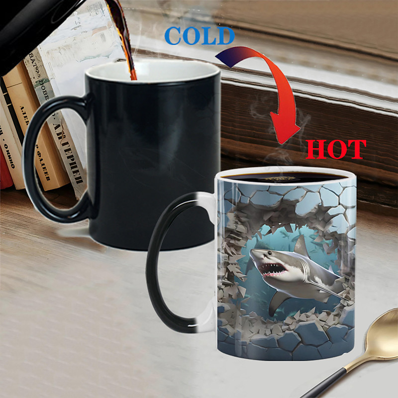 Heat Changing Mug, Shark Heat Changing 3D Illusion Ceramic Gift Coffee Mug, 11 oz Heat Sensitive Color Changing Coffee Mug Cup, Cute Xmas Gift Mug for Shark Lover