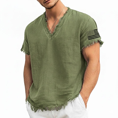Herren-T-Shirt mit amerikanischer Flagge am Ärmel, bedruckt aus Leinen-Baumwoll-Mischgewebe, V-Ausschnitt, offene Kanten, patriotisches Sommer-Strand-Shirt mit USA-Motiv, ausgefranst, weich, modisches