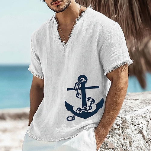 Großes Herren-T-Shirt mit nautischem Ankerkettenmuster aus Leinen-Baumwoll-Mischgewebe, V-Ausschnitt, offene Kanten, Sommer-Strandurlaub-Segelshirt, ausgefranstes, weiches Freizeittop, Größen S-3XL