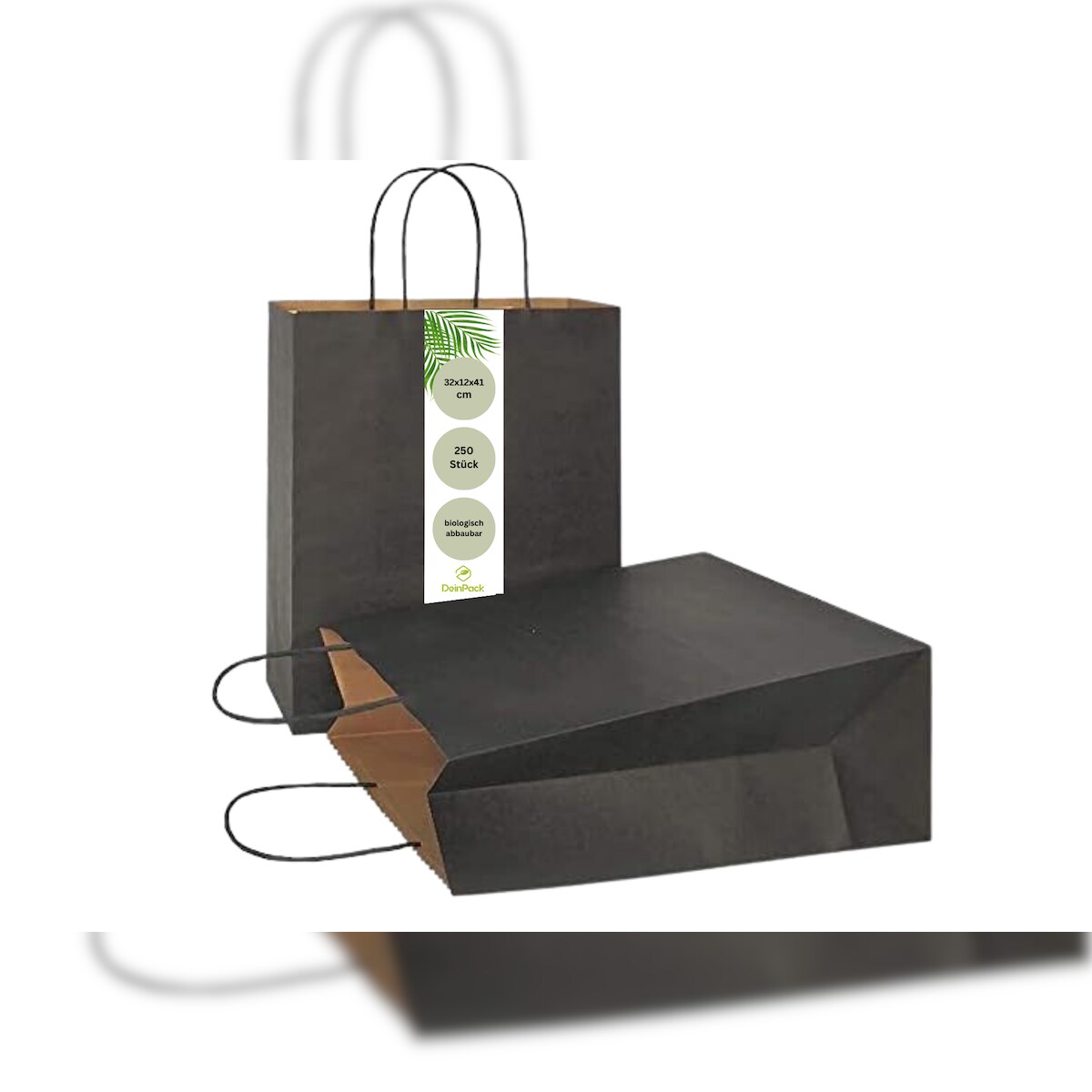 DeinPack Papiertüten aus Kraftpapier - 250 x schwarze Papier Tüten 32 x 12 x 41 cm