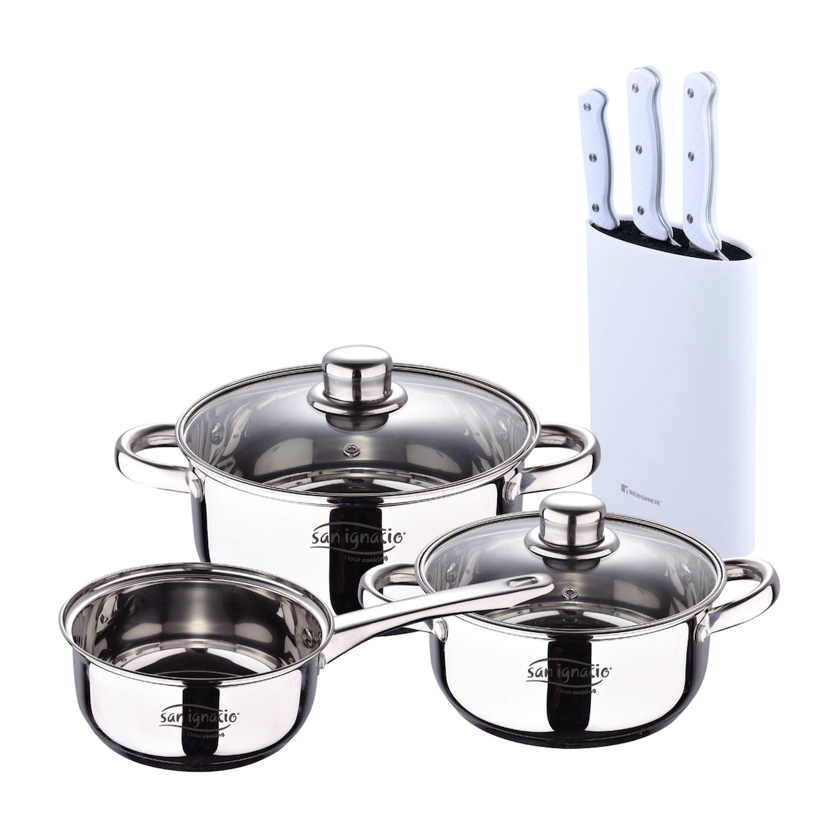 BERGNER - Kochgeschirr 5-teilig 16/18/20 cm aus Edelstahl, induktionsgeeignet, mit 3-teiligem Messerset aus Edelstahl