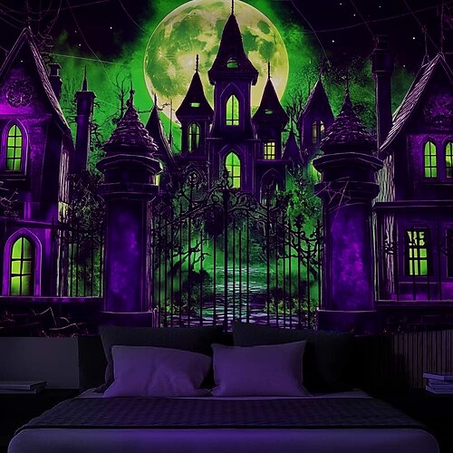 Tappeto nero di Halloween strega reattivo ai raggi UV scintillante nel buio foresta montagna nebbiosa cimitero fantasma appeso arte muro per soggiorno camera da letto