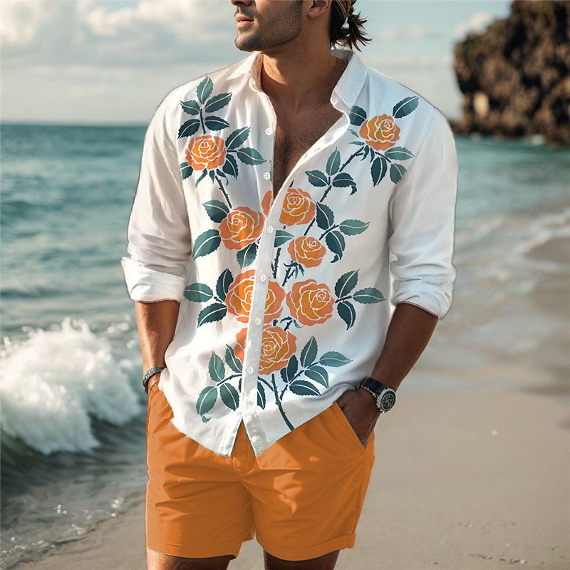 Men's Rose Shirt Western Shirt Cowboy Shirt Long Sleeve Hawaiian Casual Daily Wear Going out Spring Turndown Print Button-Down Red Blue Purple Orange