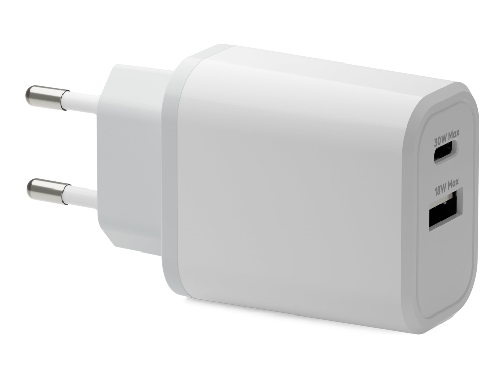 dbramante1928 re-charge - Strømforsyningsadapter - 30 Watt - 3 A - PD/PPS - 2 output-stikforbindelser (24 pin USB-C, USB) - hvid - Europa