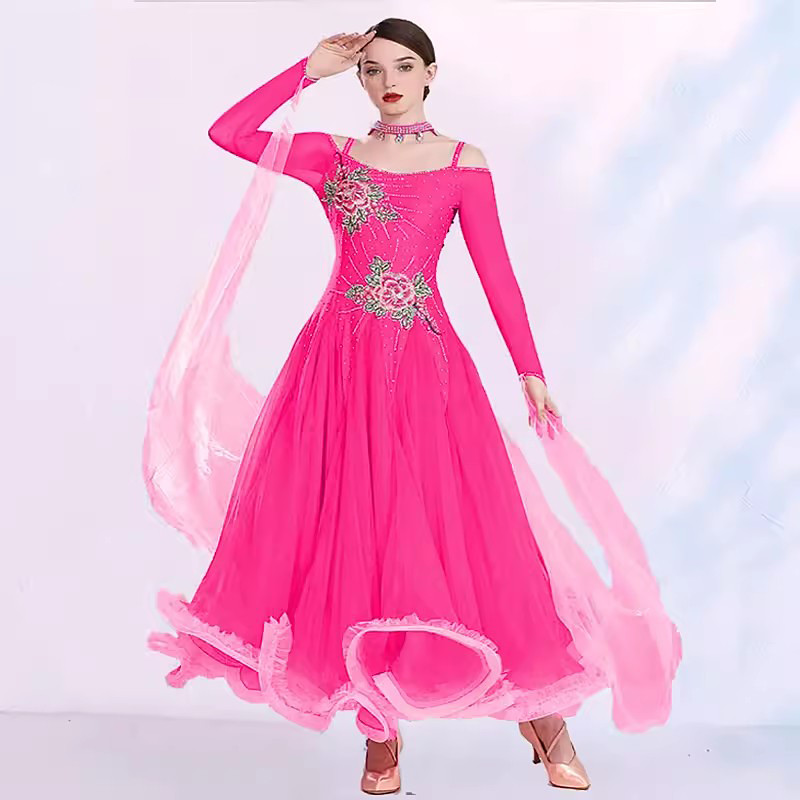 Ballroom Dance Dress Embroidery Splicing Crystals / Rhinestones Women's Performance Party Long Sleeve Mesh Spandex Organza