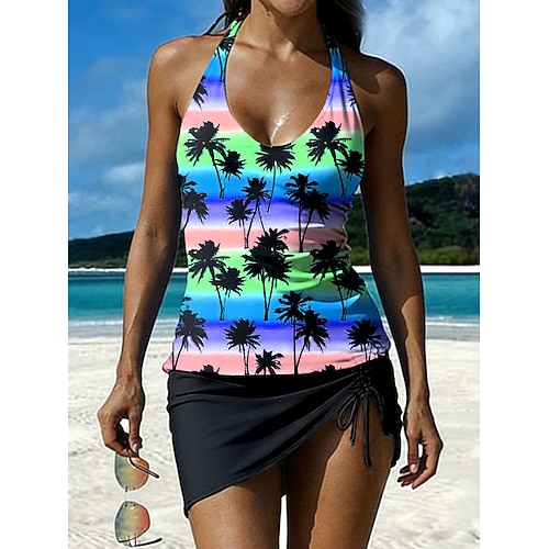 Costume da bagno a due pezzi da donna tankini palma vita alta attivo vacanza con grafica floreale scollatura tonda senza maniche