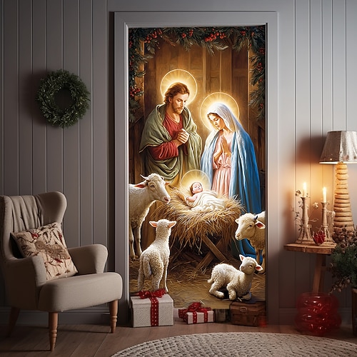 Copertura per porta natalizia, design del presepe, tenda natalizia, sfondo da appendere per l'ingresso di casa, decorazione a tema invernale, decorazione natalizia per le celebrazioni festive di