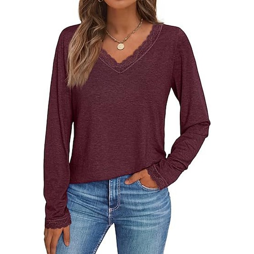 Per donna Camicia Blusa Semplice Moderno Casual Manica Lunga Scollo a V Top Regolari Quotidiano Ferie Uscire Pizzo Patchwork Nero Bianco Vino Blu Autunno