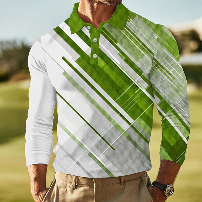 Men's Geometic Line Polo Long Sleeve Polo Shirts Lapel Business Casual Athleisure Daily Wear 3D Print Buttons Spring Fall Winter Blue Green Light Blue
