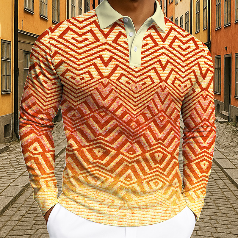Men's Geometic Polo Long Sleeve Polo Shirts Lapel Casual Street Athleisure Daily Wear 3D Print Buttons Spring Fall Winter Blue Orange Green
