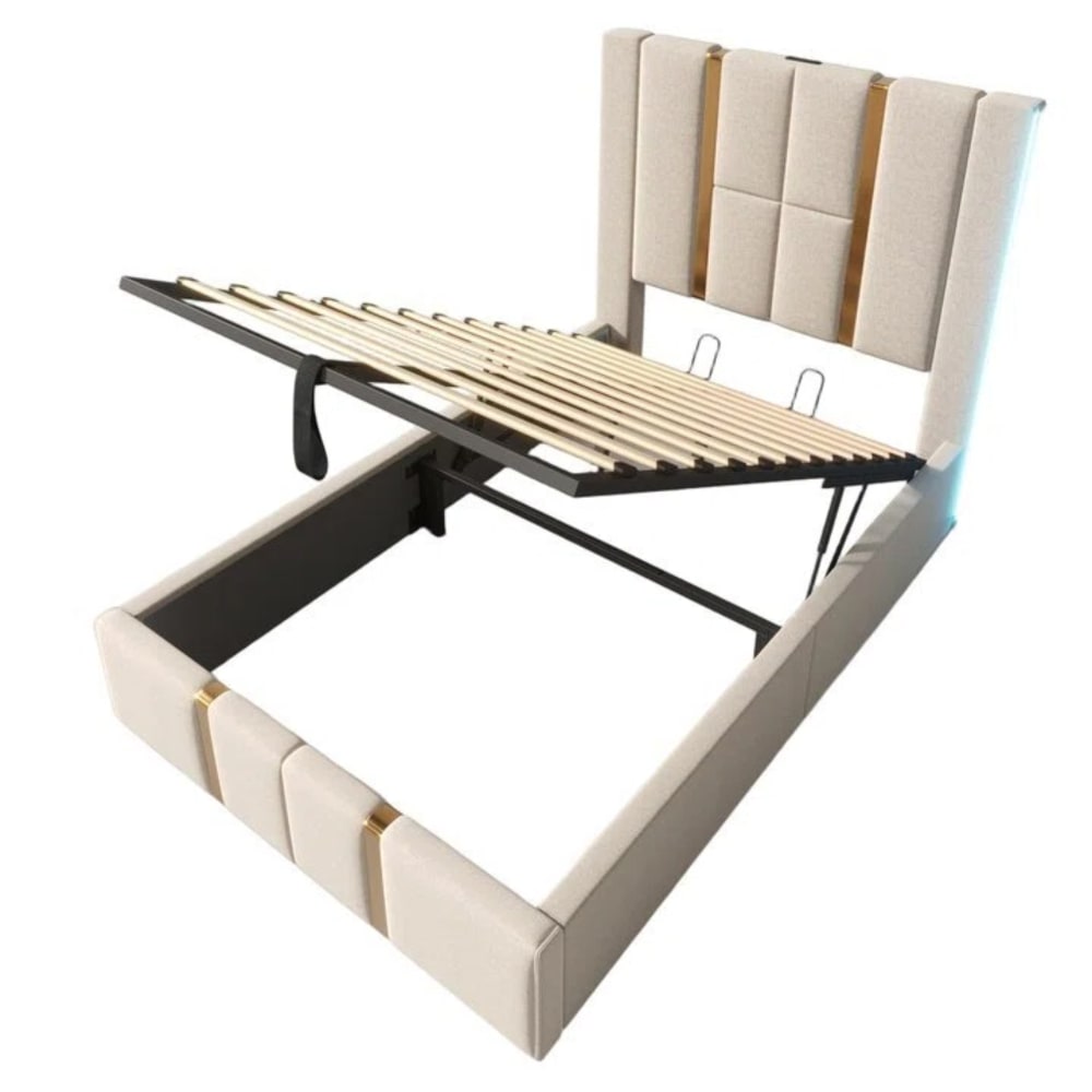 Letto per bambini in tessuto di lino beige 90x200cm con ricarica USB