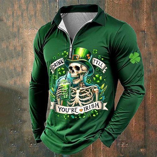 San Patrizio Per uomo Quadrifoglio Teschi cool Polo con zip Manica Lunga Magliette polo Bavero Casual All'aperto Abito da festa Stampa 3D Primavera Autunno Inverno Nero Verde scuro Verde
