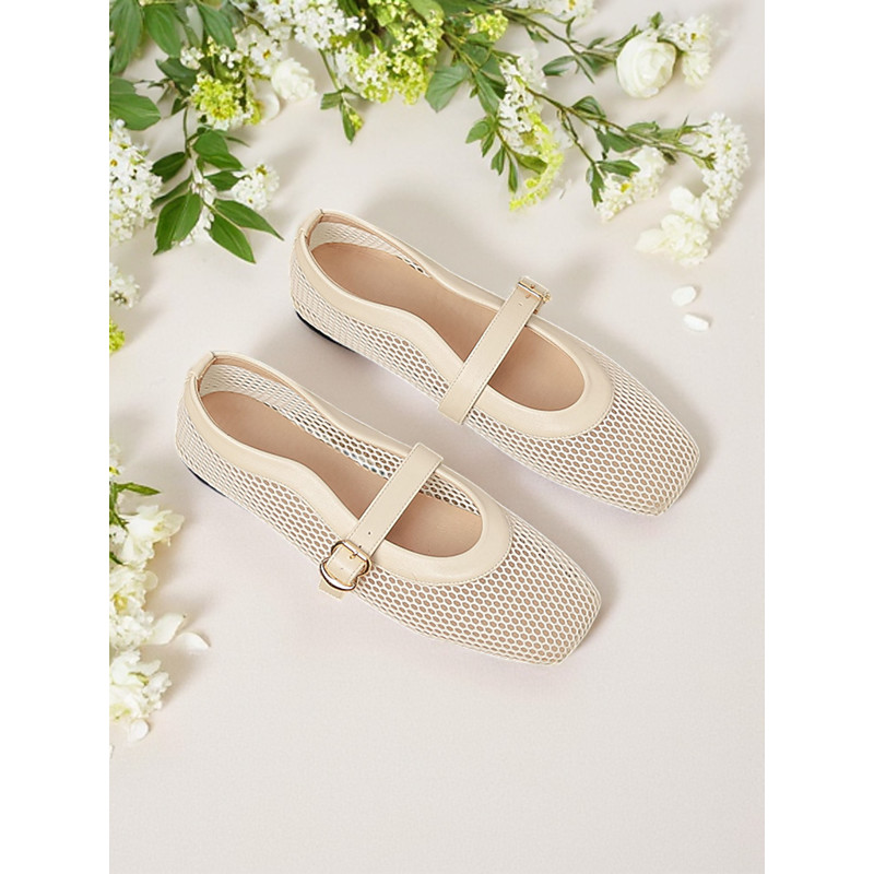 Women's Gold Mesh Mary Jane Flats – Elegant Low Heel Date Shoes with Buckle Strap for Casual Outings and Daily Wear