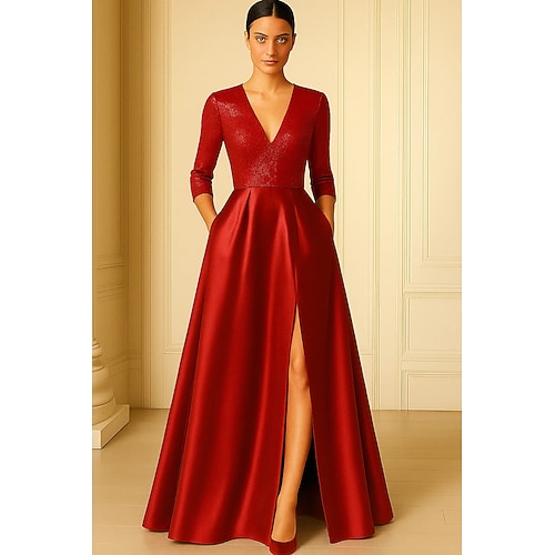 Linea ad A Lunghezza al pavimento Abito da Sera Da principessa Abito formale Elegante Setoso Manica 3/4 Scollo a V Ospite di nozze Cocktail party Raso con Spacco