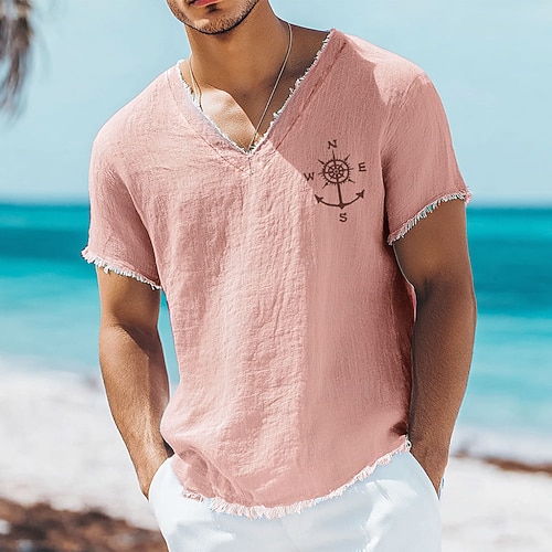Herren-T-Shirt mit nautischem Kompass- und Ankerprint aus Leinen-Baumwoll-Mischgewebe, V-Ausschnitt, offene Kanten, atmungsaktives, weiches Designer-Top für Sommerurlaub und Strandurlaub, Größen S-3XL