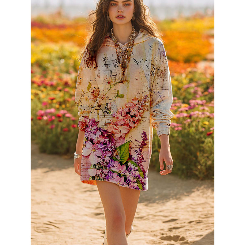Women's Hoodie Dress Mini Dress Shift Dress Casual Boho School Outdoor Vacation Regular Fit Floral Graphic Long Sleeve Hooded Apricot Spring Fall Winter