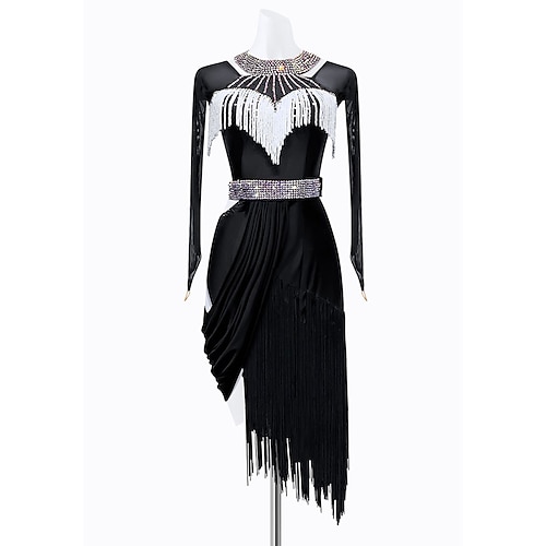 Abito da ballo latino da donna con frange di strass bianchi e neri - costume da ballo asimmetrico da sala con cintura di perline e girocollo a maniche lunghe