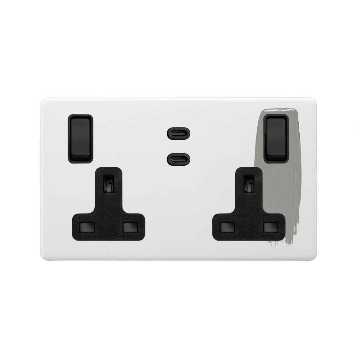 Soho Lighting Primed Paintable 2 Gang 65W USB C+C Socket (13A Socket + 2 USB C Ports) with Matt Black Switch - Size: 86mm x 146mm x 4.5mm