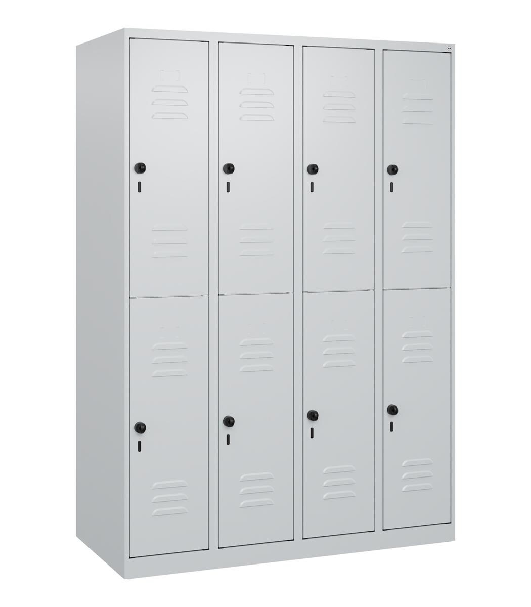Doppelstock-Spind Classic PLUS, 4 Abteile, lichtgrau / lichtblau, HxB 1850 x 1200 mm, mit Bodengleitern, Zylinderschloss C+P