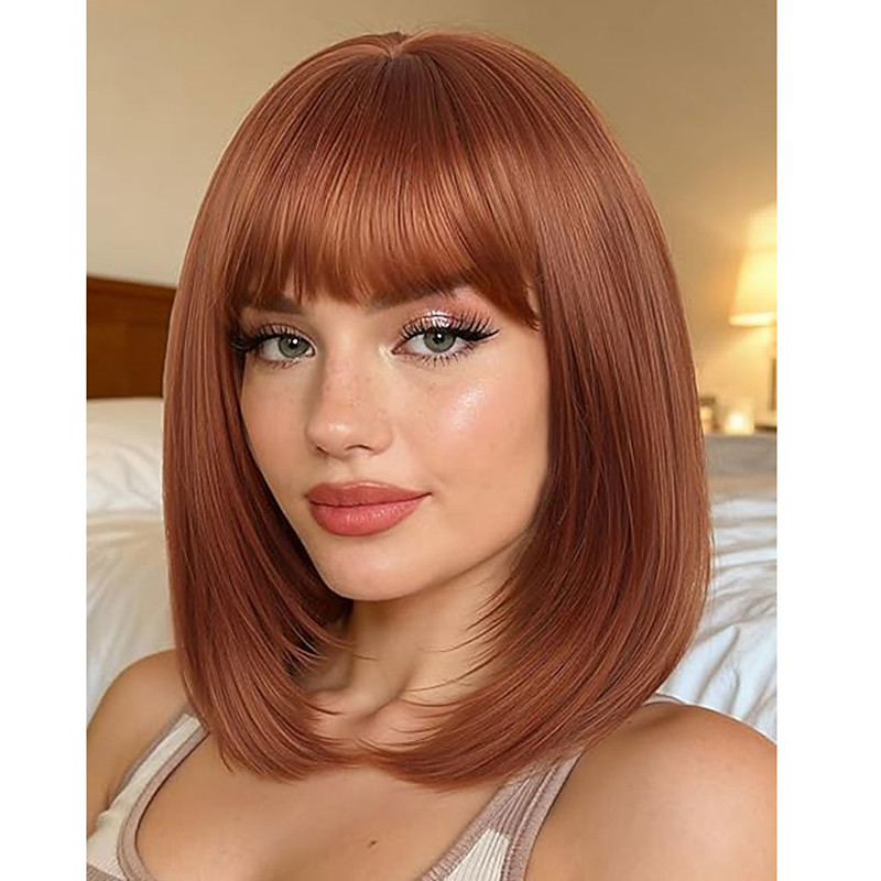 HAIRCUBE Cosplay Bob Wig with Bangs Auburn/Ombre Brown/Pink/green/Wine Synthetic Culy Wigs for African American Women Natural ChristmasPartyWigs
