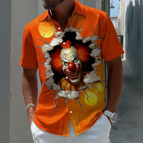 Herren Gruseliger Clown Teufel Clown Hemd Sommerhemd Knopfhemd Kurzarm Dark Punk Gothic Ferien Streetwear Sommer Frühling Umlegekragen 3D-Druck Hemden mit Kragen Rot orange Orange