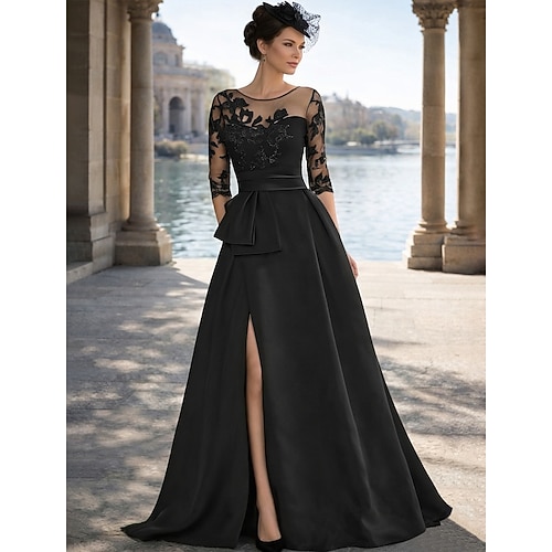 Linea ad A Strascico da Corte Abito da invitata a nozze Abito Formale Abito svasato Abito da cerimonia per signora Manica 3/4 Collo gioiello Abito Nero Spacco Alto Ospite di nozze Autunno Raso con