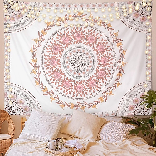 Wandteppich mit rosa Rosen-Mandala, cremefarbenen Blüten und botanischen Ranken in symmetrischem Muster – ideal für Schlafzimmer, Wohnzimmer, Studentenwohnheim oder als ästhetische Partykulisse.