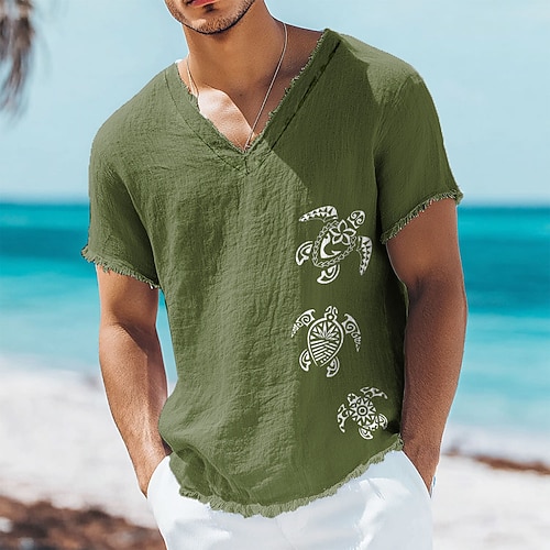 Herren-T-Shirt mit dreifachem Tribal-Meeresschildkröten-Print aus Leinen-Baumwoll-Mischgewebe, V-Ausschnitt, offene Kanten, polynesischer Honu-Stil, Sommer-Strandurlaubs-T-Shirt, ausgefranstes,
