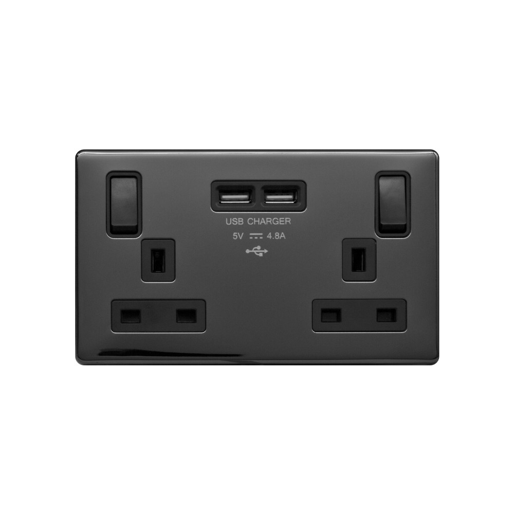 Lieber Black Nickel 2 Gang 13A DP Socket with 2 x USB-A 4.8A - Size: 146mm x 86mm x 2.75 mm