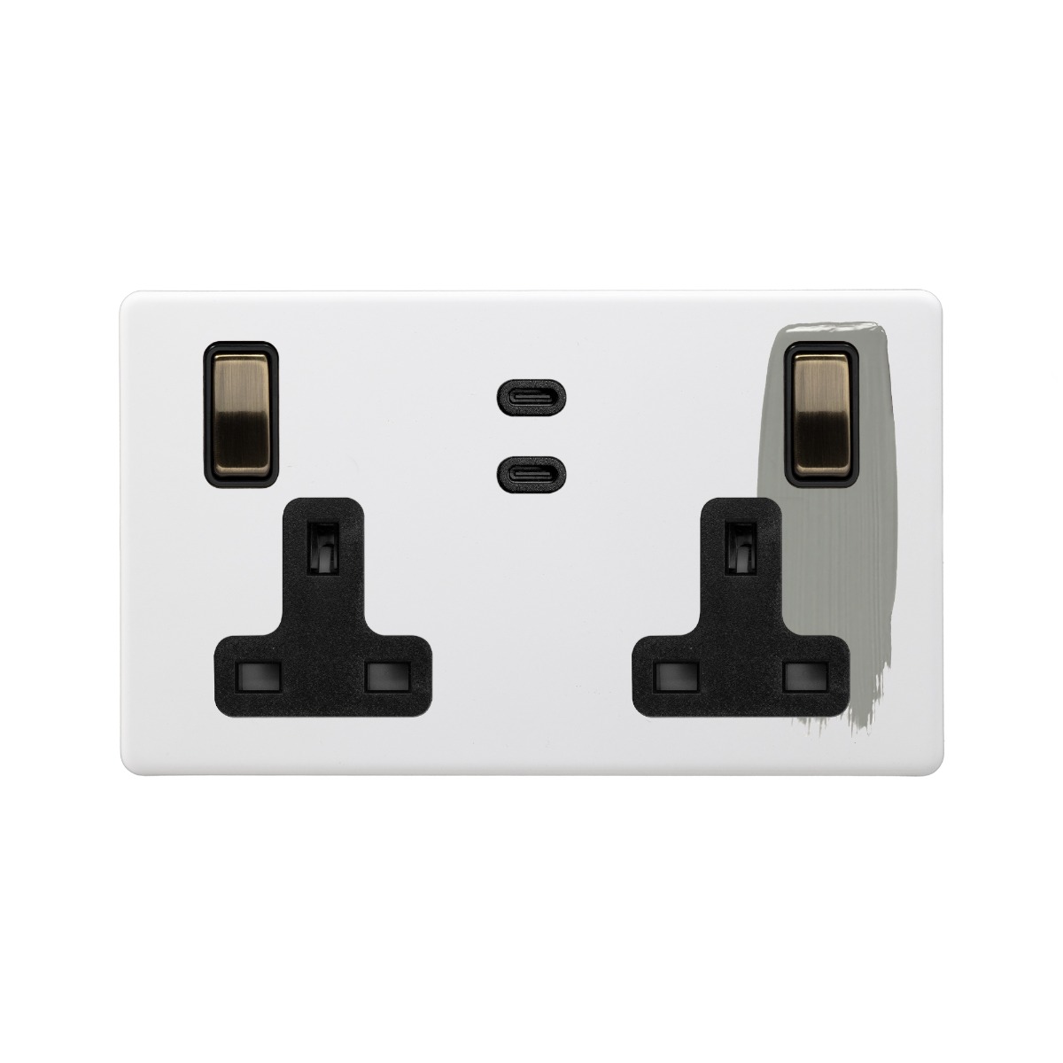 Soho Lighting Primed Paintable 2 Gang 65W USB C+C Socket (13A Socket + 2 USB C Ports) with Antique Brass Switch - Size: 86mm x 146mm x 4.5mm