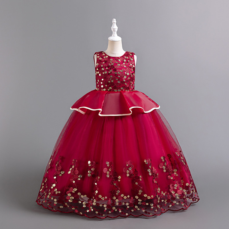 Flower Girl Dress Girls' Formal Dress Wedding Attire Prom Party Wedding Elegant Fashion Adorable Sequins Patchwork Floral Sleeveless Crew Neck Blue Wine Red 4 years