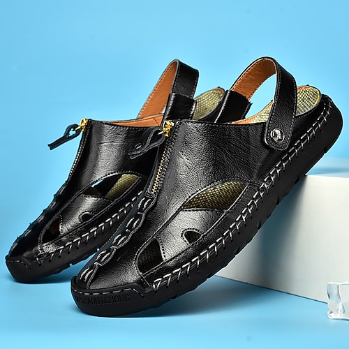 sandali chiusi da uomo in similpelle marrone, scarpe casual traspiranti cucite a mano per l'estate, all'aperto e in spiaggia
