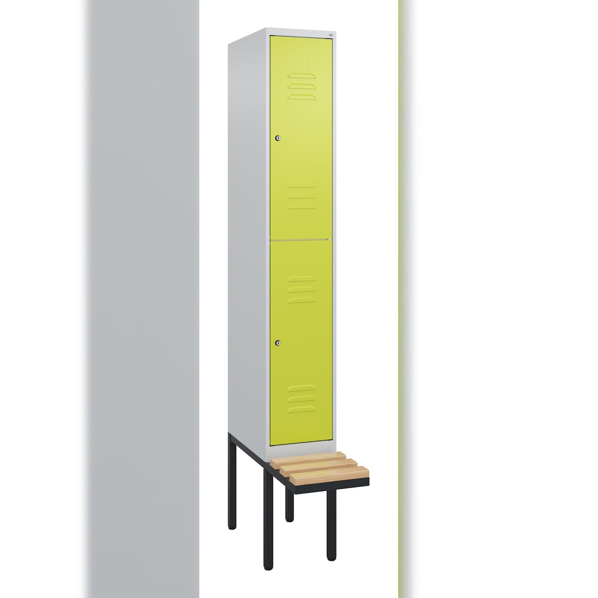 C+P Spind Classic PLUS, Buche schwebende Sitzbank, 2 Abteile, HxBxT 212x30x82cm, Zylinderschloss, Hellgrau/Clowngrün von PROREGAL