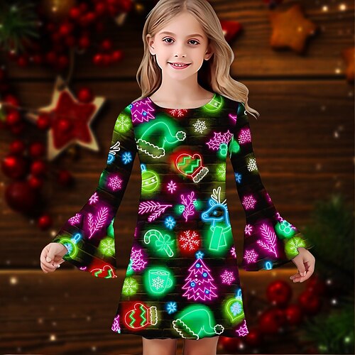 ragazze' 3D Pop art Albero di Natale Vestito di Natale Vestito Abito con balze Manica lunga Estate Primavera Da mare Giornaliero Per eventi Bellissimo Dolce Bambino 4-12 anni Abito casual Al ginocchio