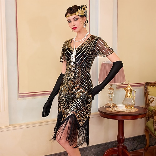 Anni Ruggenti Anni 1920 Lunghezza al ginocchio Abito Flapper Maniche corte Il grande Gatsby Paillettes Frange Scollo a V Costume Per donna Natale Carnevale Mascherata Festa a tema retrò Danza