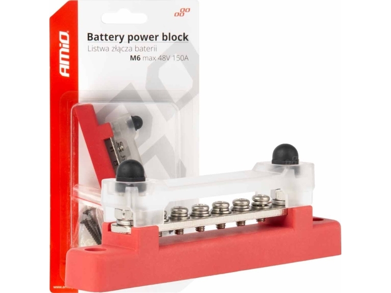 Teigiamo poliaus galios paskirstymo blokas su 4 M6 varžtais, Bus Bar 12/24/48V 150A, AMIO-03810