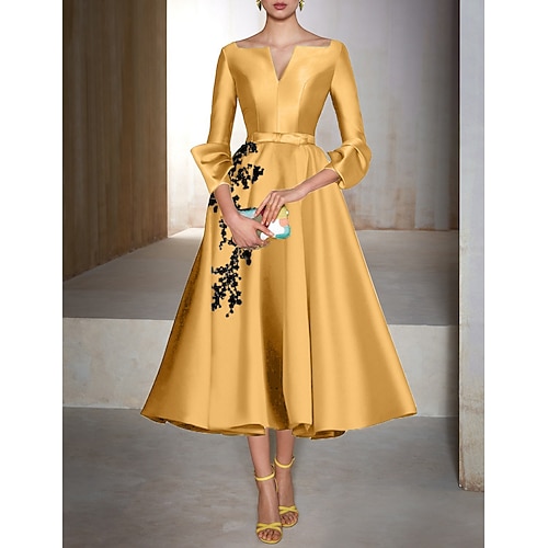 Linea ad A Lunghezza Tè Abiti da Cocktail Abiti da festa Elegante Floreale Manica 3/4 Scollo a V Matrimonio Ospite di nozze Raso con Fiocco/Fiocchi Applicazioni