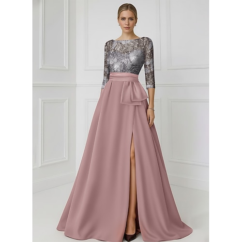 Linea ad A Lunghezza al pavimento Perline ricamate Abito Formale Abito da madre della sposa Abito da Sera Elegante Spacco Alto Manica 3/4 Girocollo Matrimonio Formale Raso Con Paillettes con
